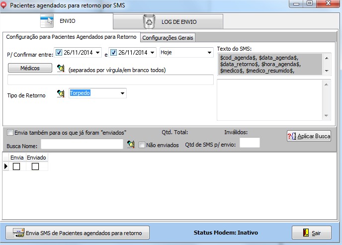 | Envia SMS de pacientes Agendados | Permite o envio após selecionado. |