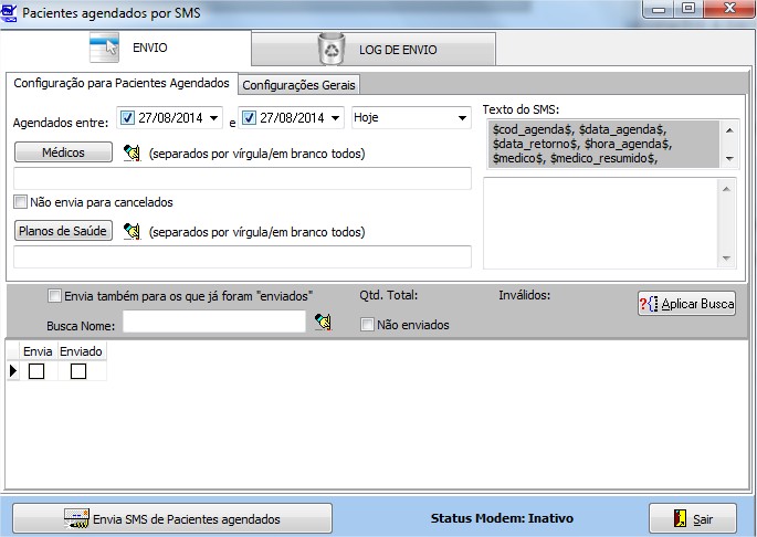 | Plano de Saúde | permite definir o envio de SMS para agendados por plano de saúde. |
