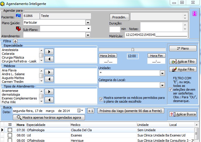 | Aparecerão os horários disponíveis de acordo com os filtros colocados | Entre os filtros apresentados, temos o filtro de Especialidade, que mostra apenas os médicos e horários disponíveis para aquela especialidade. Temos o filtro de médicos, que mostra apenas os horários disponíveis para aqueles médicos selecionados. Temos o filtro de ficha de dados que mostram os médicos e horários disponíveis para aquela ficha de dados. Temos o filtro de horário, mostra apenas os horários dentro daquela faixa de horário determinada. Temos o filtro por unidade, mostrando apenas os horários disponíveis daquela unidade.