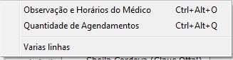 | “Quantidade de Agendamentos” | ao clicar com o botão direito nas abas inferiores, que mostrará as informações referentes ao total de agendamentos durante a manhã e durante a tarde, do médico ou local da aba que se esteja visualizando e da clínica inteira. |
