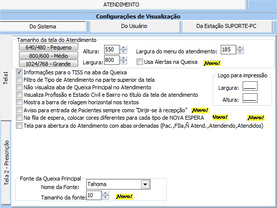 | Tamanho da tela do atendimento | permite definir o tamanho da visualização da tela do atendimento. |