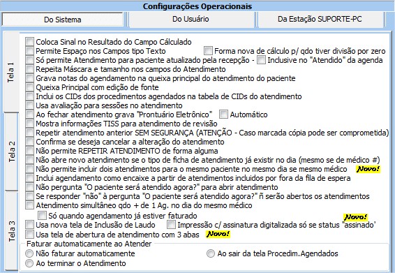 | Usa tela de abertura de atendimento com 3 abas | Permite usar abertura de atendimento com 3 abas. |