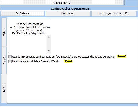 | Tipos de Finalização do Pré-Atendimento na Fila de Espera | Permite com que no menu do botão direito na fila de espera tenha, além do finalizar o pré-atendimento de forma simples, tenha o finalizar colocando uma determinada descrição em notas (da mesma forma que o re-espera faz). Dessa forma é só configurar em "Ferramentas - Configuração - Sistema - Operacional - Atendimento - Do Usuário - Tela 2 - Filtro de Notas para a Fila de Espera" para que a fila de espera apareça filtrada para um usuário pela descrição que seja para ele visualizar. |