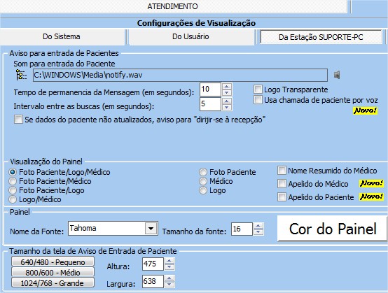| Tamanho da tela de aviso de entrada de paciente | permite configurar o tamanho da tela da chamado do paciente. |