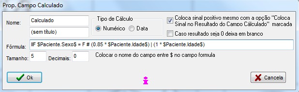 Configuração Exemplo: IIF $Paciente.Sexo$ = F # (0.85 * $Paciente.Idade$) | (1 * $Paciente.Idade$)@. Essa fórmula fará o seguinte: Se for do sexo for feminino o cálculo será "0,85 x a idade do paciente" enquanto se o sexo for diferente de feminino (masculino ou branco) será "1 x a idade do paciente".