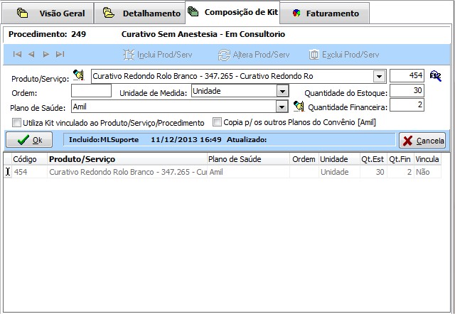 caso o procedimento tenha kit, marcar opção para incluir somente o Kit, não inclui procedimento.