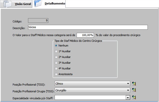 | O valor para o Staff Médico nessa categoria será de __ % de valor do procedimento cirúrgico | Percentual referente o valor do repasse ou a da Equipe Cirúrgica.Ex:30% do 1º Auxiliar, 20% do 2º Auxiliar.O percentual definido sairá calculado na Guia de honorário. |