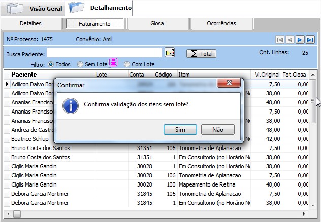 | Nessa aba são mostrados todos os procedimentos que fazem parte da cobrança. Será mostrado por item de cada paciente o valor faturado do item, o valor glosado dele e o valor recebido (que é o valor original menos o valor glosado) | |