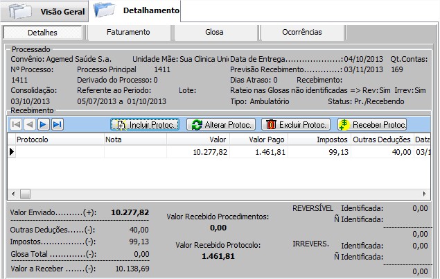 | Recebimento | Data que foi realizado o fechamento da cobrança, finalizando o recebimento dela ou gerando um sub-processo com as glosas reversíveis que poderão ser reapresentadas. |