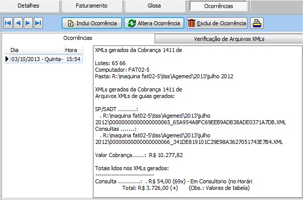 | Nessa aba são mostradas as ocorrências da cobrança. Pode-se incluir a qualquer momento um registro das atitudes tomadas em relação à cobrança permitindo um bom acompanhamento da mesma. Além disso são incluídas ocorrências automaticamente ao se usar a opção "TISS" para o armazenamento das informações referentes ao XML gerado para o convênio | |
