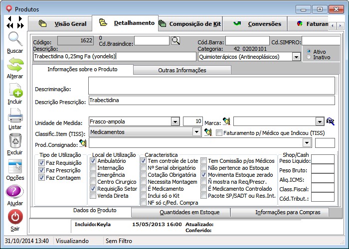 Tipo de Utilização: marcar "Faz Requisição" e "Faz Prescrição".