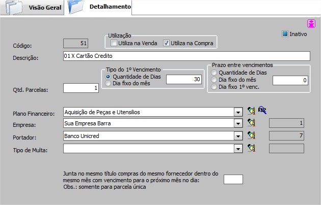 | Tipo de Multa | Permite definir o tipo de multa, caso de atraso. |