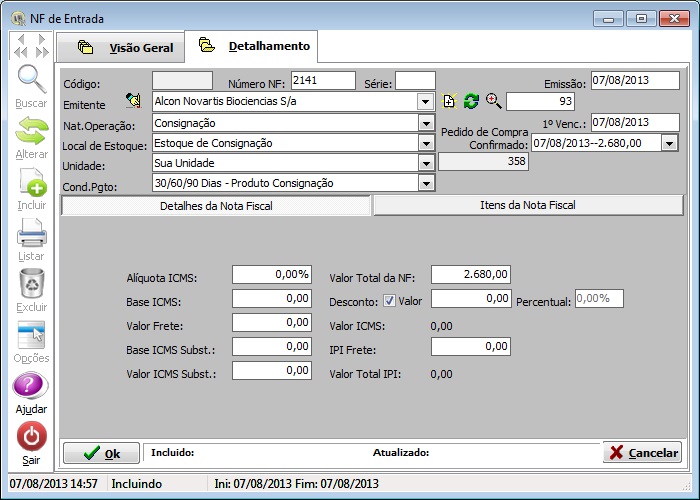 Caso haja pedido de compra, incluir a nota fiscal associando o pedido confirmado e informando a natureza de operação. Se não, incluir a nota com as informações da nota, natureza de operação, local de estoque, unidade e condição de pagamento.