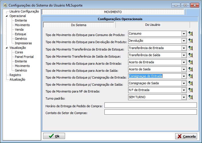Configurar o tipo de movimento de consignação de entrada/saída em ferramentas> configurações> sistema> movimento.