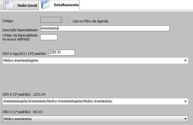 | CBO-S(2º Padrão):2231.04 | Classificação Brasileira de Ocupações em Saúde, indicando a especialidade médica que será utilizada nas guias dos convênios de acordo com o layout TISS. |