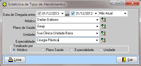 | Totalizado por | permite selecionar as informações que serão totalizadas por "médico", "plano de saúde", "especialidade", "unidade", "tipo de atendimento" ou "paciente".