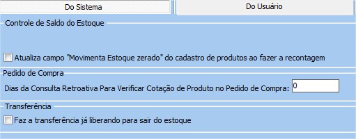 | Controle de saldo de Estoque | Permite definir o controle de saldo do Estoque. |