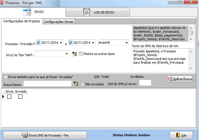 | Processo | Previsão Início - Permite informar o período que deseja enviar sms. |