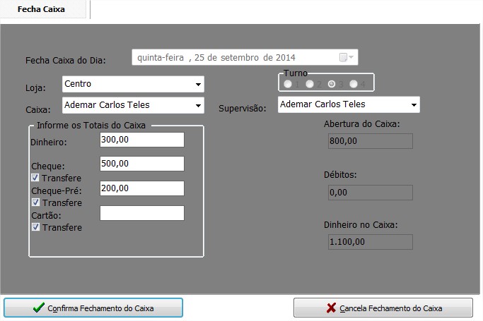 | Turno | Permite informar o turno referente ao fechamento do Caixa |