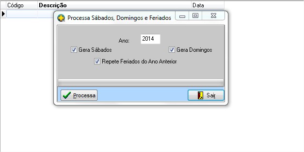 | Processa sábados, domingos e feriados | Serão gerados, de acordo com o ano solicitado, o registro dos sábados, domingos e se solicitado, os feriados do ano anterior serão repetidos para o ano que se está gerando. |