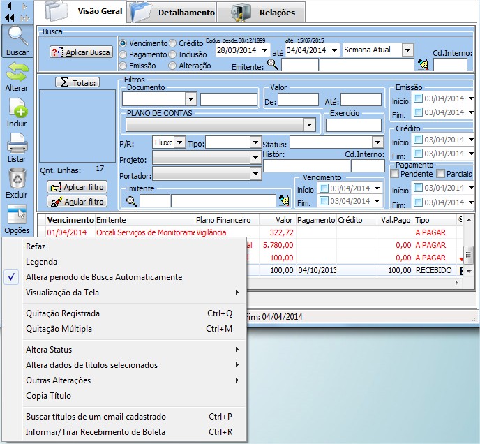| Visualização da tela | Volta Original - Volta a configuração da tabela dos títulos para a original, onde são mostradas todas as informações em uma determinada ordem das colunas. Tirar colunas - Permite que a coluna da tabela dos títulos selecionada (em negrito) seja retirada da tela.