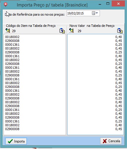 - importa preços a partir de um documento onde se consiga copiar uma coluna com os códigos e outra com os valores, por exemplo um documento de excell. A coluna de código deve corresponder aos códigos cadastrados nos preços da tabela de preço para onde os preços estão sendo importados para que possa haver uma associação dos itens do documento com os itens do Clinic Master.