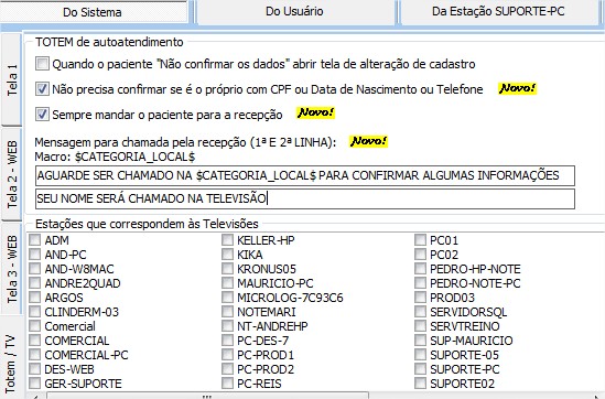 | Mensagem para chamada pela recepção (1ª E 2ª LINHA) | permite configurar o texto que será visualizado pelo paciente no totem ao confirmar que é ele mesmo. Se colocar a macro $CATEGORIA_LOCAL$, ela será trocada pelo nome da categoria do local de agendamento do paciente. |