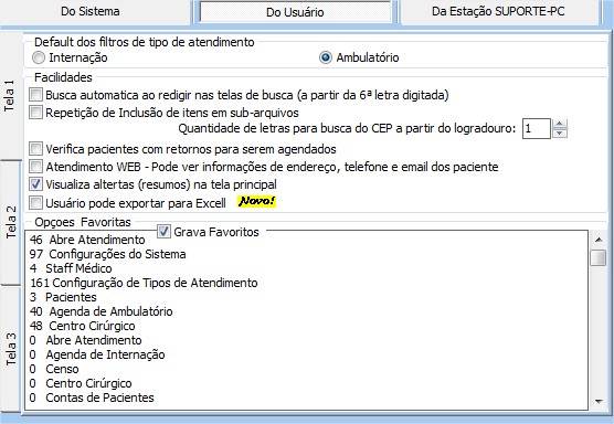 | Opções Favoritas | permite visualizar as telas favoritas. |