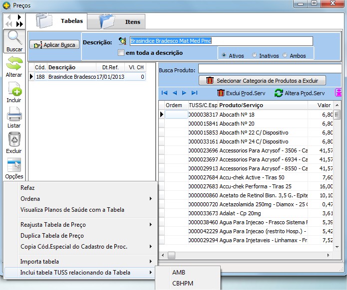 | 5º | Nessa tela, no menu lateral, clique no botão Opções> Inclui tabela TUSS relacionada da Tabela> AMB ou CBHPM(dependendo do tipo de tabela que estiver utilizando). |