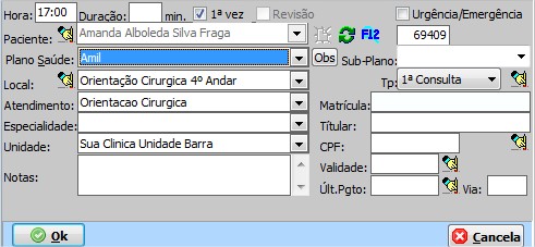 | Duração | duração do atendimento ao paciente. Se for maior do que o pré-determinado na grade de horários do médico, o sistema bloqueará os próximos horários (de acordo com a duração) em nome do paciente |