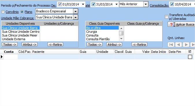 Unidade Mãe Cobrança É a unidade principal das cobranças. Se escolher somente essa unidade serão incluídos os procedimentos das contas de pacientes somente dessa unidade. Pode-se escolher outras unidades para que sejam levadas em consideração através das "Unidades Disponíveis", clicandp-se em "Atribui"