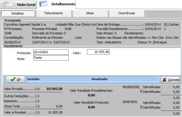 | Incluir Protocolo | Após o envio do Arquivo XML, informar o número do protocolo, a nota e o valor, pressione o botão Ok para confirmar. |