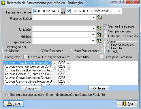 Categ. Prod./Mostra a "Descrição p/ Conta ao marcar esta opção o relatório incluirá todas as categorias de produtos relacionadas ao paciente, se desmarcada possibilita filtrar por categoria de produto.