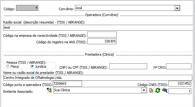 CNPFJ ou CPF (TISS/ABRANGE) permite informar o CNPJ ou CPF do convênio.