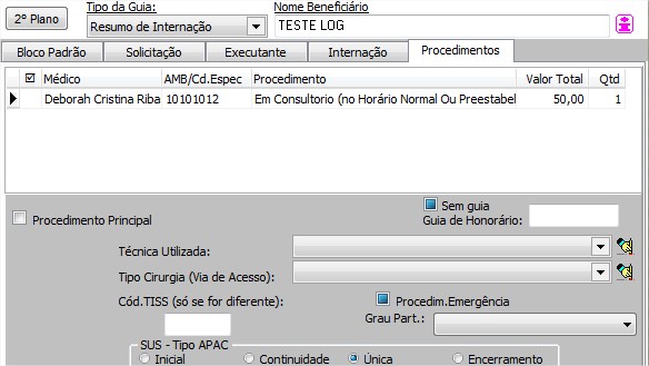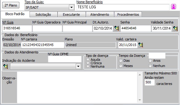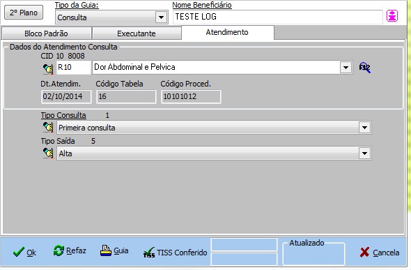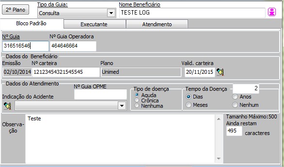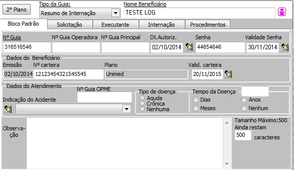 Permite informar/Conferir dados da carteira do Plano de Saúde do Beneficiário (Paciente).