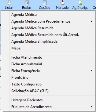 | Agenda médica | Permite imprimir uma listagem com todos os pacientes agendados para um determinado médico. |