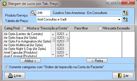 | Categ. Prod./Mostra a "Descrição p/ Conta | ao marcar esta opção o relatório incluirá todas as categorias de produtos relacionadas ao paciente, se desmarcada possibilita filtrar por categoria . |