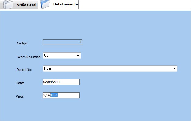 | Descrição | Permite informar a descrição da moeda estrangeira. |