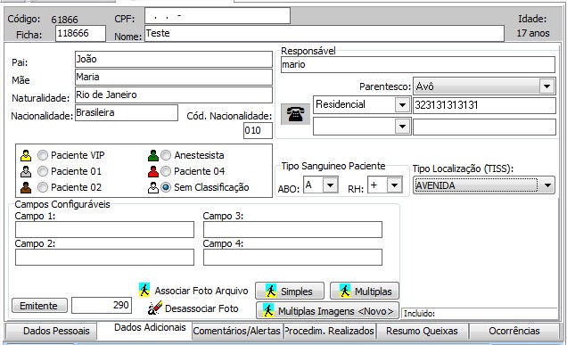 Possibilita até 5 tipos de classificações para diferenciar os pacientes na agenda, onde aparecerão com o boneco com a respectiva cor ao lado do nome. Obs.: Essas classificações são definidas nas configurações do sistema. Ex.: "paciente ouro", "paciente prata", "paciente bronze", etc.