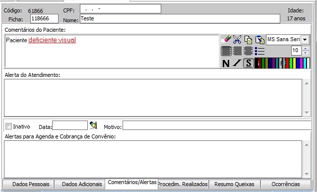 Campo livre para escrever alertas que aparecerão quando for agendado e dada a chegada do paciente na clínica.