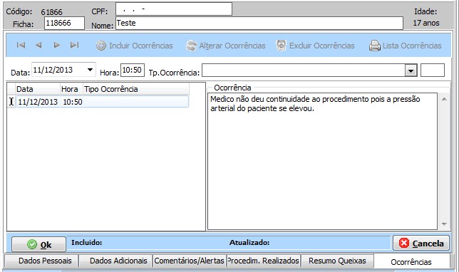 | Tabela utilizada para anotar qualquer ocorrência em relação ao paciente, que não seja de agendamento, faturamento e atendimento, e possa a vir precisar no futuro.