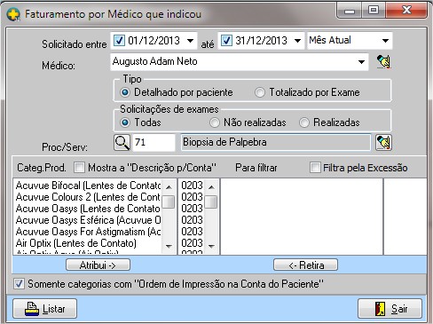 Categ. Prod./Mostra a "Descrição p/ Conta ao marcar esta opção o relatório incluirá todas as categorias de produtos relacionadas ao paciente, se desmarcada possibilita filtrar por categoria de produto.
