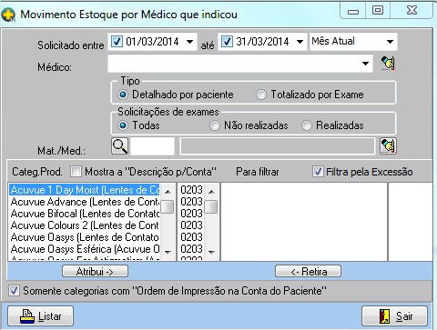 | Mat/Med | Permite filtrar por categoria do produto, ou, um produto específico. |