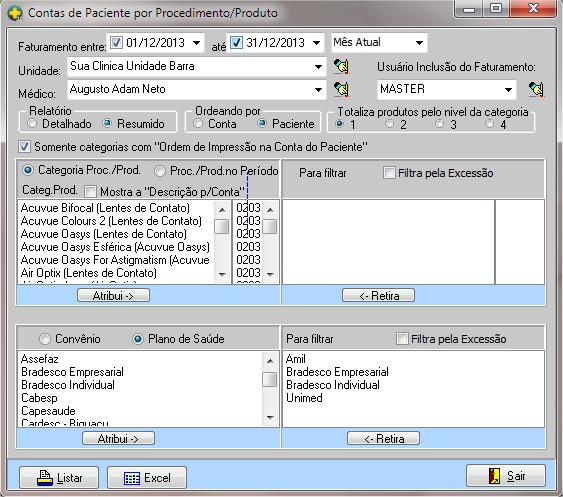 | Categ. Prod./Mostra a "Descrição p/Conta" | marcando esta opção permite um detalhamento do procedimento/produto no relatório. |