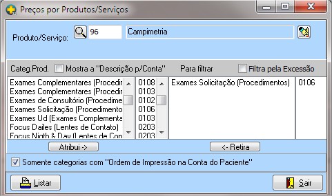 | Categ. Prod./Mostra a "Descrição p/ Conta" | ao marcar esta opção o relatório incluirá todas as categorias de produtos relacionadas ao paciente, se desmarcada possibilita filtrar por categoria . |