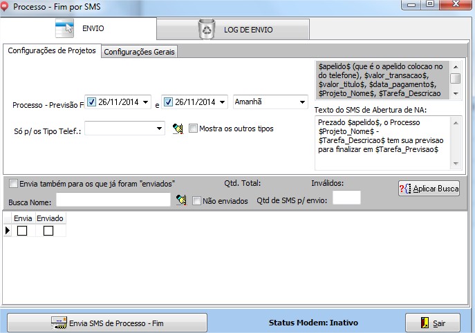| Processo | Previsão Fim - Permite informar o período que deseja enviar sms. |