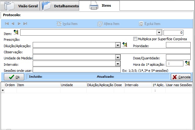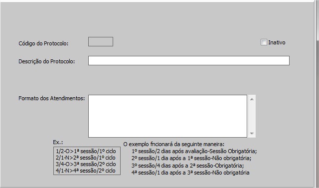 - Protocolos de tratamento que serão utilizados nos atendimentos.Ao utilizar um desses protocolos será possível marcar as sessões pela Agenda Simultânea no formato definido no protocolo.