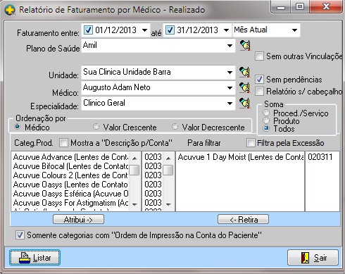 | Categ. Prod./Mostra a "Descrição p/ Conta | ao marcar esta opção o relatório incluirá todas as categorias de produtos relacionadas ao paciente, se desmarcada possibilita filtrar por categoria de produto. |