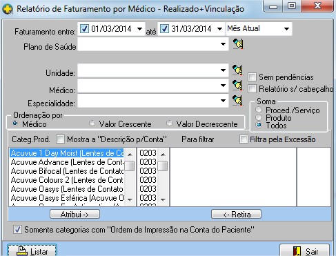 | Categ. Prod./Mostra a "Descrição p/ Conta | ao marcar esta opção o relatório incluirá todas as categorias de produtos relacionadas ao paciente, se desmarcada possibilita filtrar por categoria de produto. |