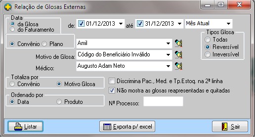 | Totaliza por | define a forma que o relatório será totalizado se por Convênio ou Motivo Glosa. |